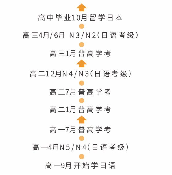 升学规划高三10月留学日本高二1-6月日本高中考试&面试高二4月N3(考试)高一8月N4(考试)高-1 2月N5(考试)初三3月开始学日语开设日语能力三级水平定向课程及日本留学生考试专项课程的同时