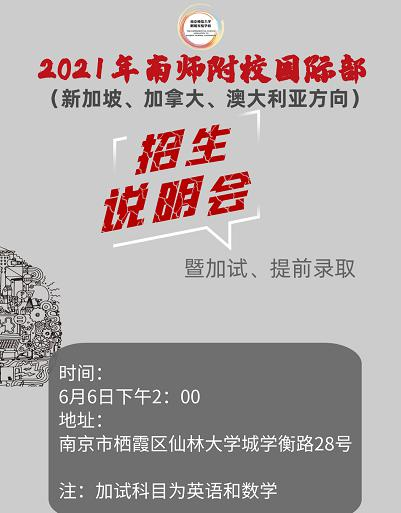 南京师范大学附属实验学校秉承百年老校南师大的优良传统,放眼世界、立足未来、服务家长,为人的成长创造的空间,充分利用自身优势资源,开发了可靠、科学、高效、相对成本较低的八个国家的国际合作与国际交流及留学通道,给有志于活跃在国际舞台、以全球为参照的家长及孩子开辟了成长与成才的特别路径。 我校国际项目依托中外双方高中及大学的优质教育资源,将中方普通高中课程与外方课程有效结合,形成一套真正适合中国学生、独具特色的本土化国际高中课程体系,旨在将学生培养成为适应跨文化交流的优秀高中毕业生,提升学生进入国外大学的竞争力,能够在全球化日渐激烈的竞争当中脱颖而出。 我校国际项目旨在培养具备全球性竞争力的高中学生,让学生通过附校的国际项目,拥有全球意识和开放的心态,了解人类文明进程和世界发展动态,尊重世界多元文化的多样性和差异性,积极参与跨文化交流,关注人类面临的全球性挑战,理解人类命运共同体的内涵与价值。 本周日下午是最后一场集中加试和招生宣讲活动。