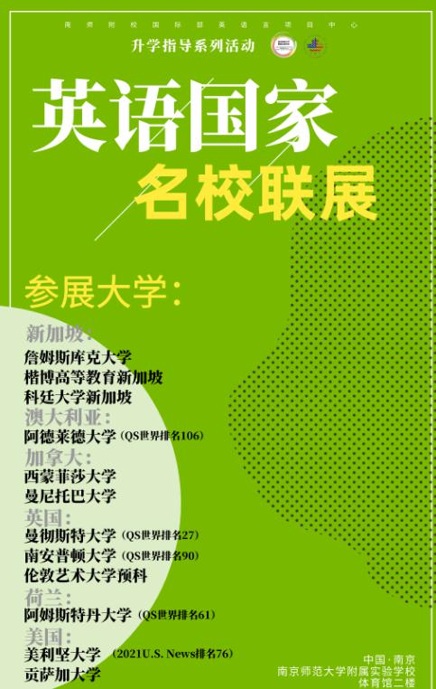 后疫情时代来临,解读世界精英教育,需要一场高质量的教育联展。南师附校国际部英语言项目中心邀请到了包括来自新加坡、英国、澳大利亚、加拿大、荷兰和美国的十二所名校在南师附校,进行了一场大型升学指导系列活动:英语国家名校联展。