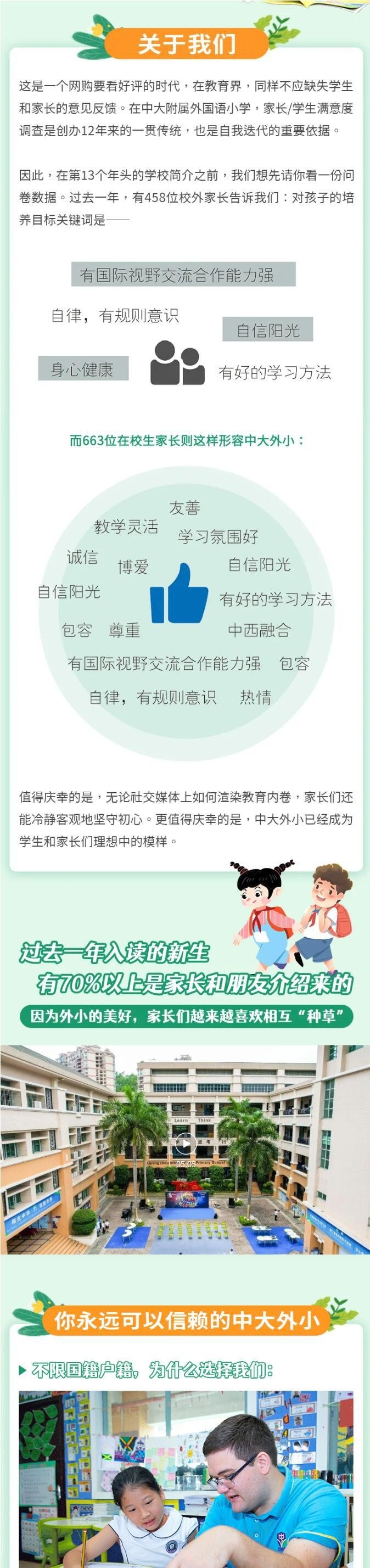 中大附属外国语小学创办于2009年9月,是IB PYP授权高品质学校。坐落在白云山脚下、南湖侧畔,高贵端庄的欧式建筑风格和典雅人性的装修设计,使之从诞生之日就洋溢着贵族气质。