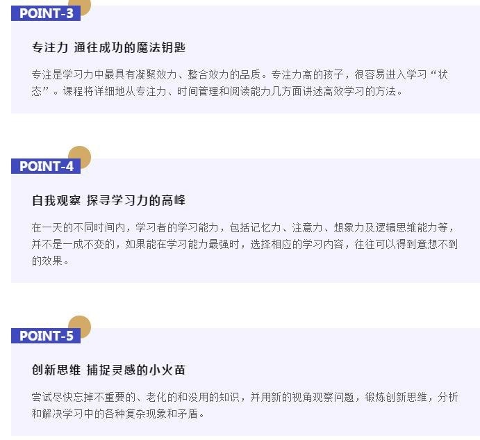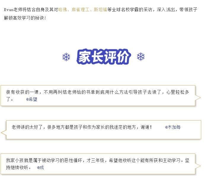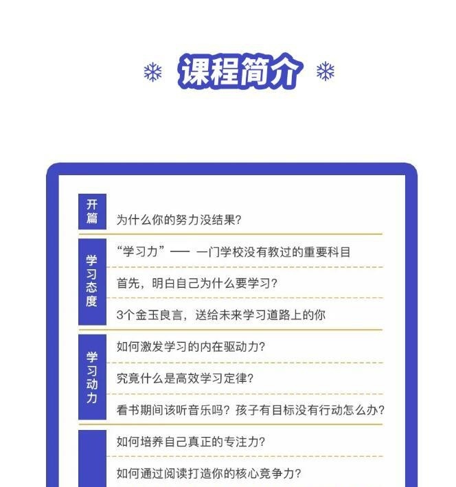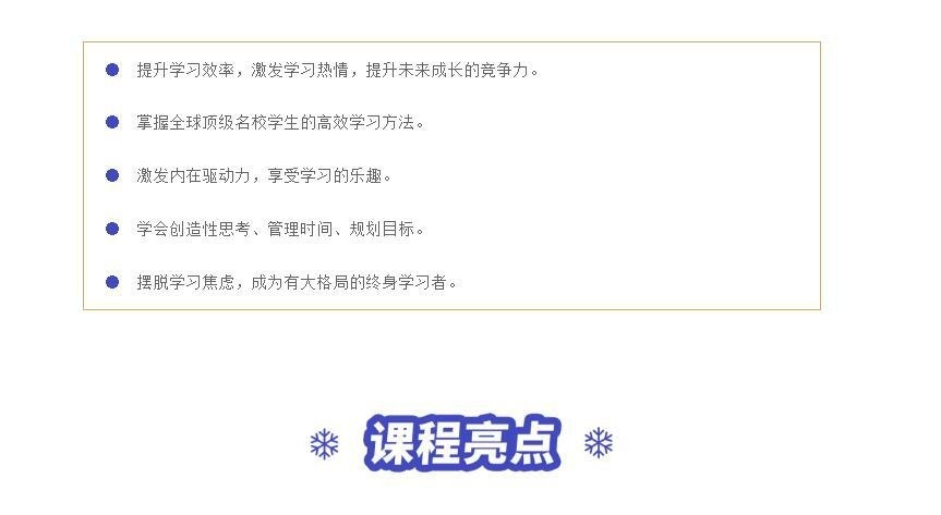 每个学生都是独一无二的 每个学生都应该受到尊重 每个学生都有成功的潜力 ··· 不忘初心,中黄始终专注孩子个性化成长 提供更适合孩子的优质教育 哈佛商学院的柯比教授(W·C·Kirby)曾说, 大部分学校是在岸上教学生游泳, 或是直接跳进水里和学生一起游泳。 而哈佛是把学生直接扔进水里, 让他自己学游泳。 唯有学习力,才能让孩子真正提升学习效率 成为学习的主人 岁末之际,为感恩家长的支持与一路相伴 中黄成长汇限时免费送出: 27节《哈佛学习力》线上精品音频课程 从学习态度、学习动力、学习方法、学习效率 创新思维和创造能力等6个维度切入 综合提升孩子学习力 带孩子领悟高效学习的真正秘诀 让孩子彻底爱上学习 专属福利 0元限量领取! 正价99元《哈佛学习力》音频课程 适用人群:6-15岁学生及家庭 活动时间:2021年1月4日-1月15日 27节课程,包含21节学习力课程 6节常见疑难问题分析解答课程 结合实际案例剖析孩子学习问题