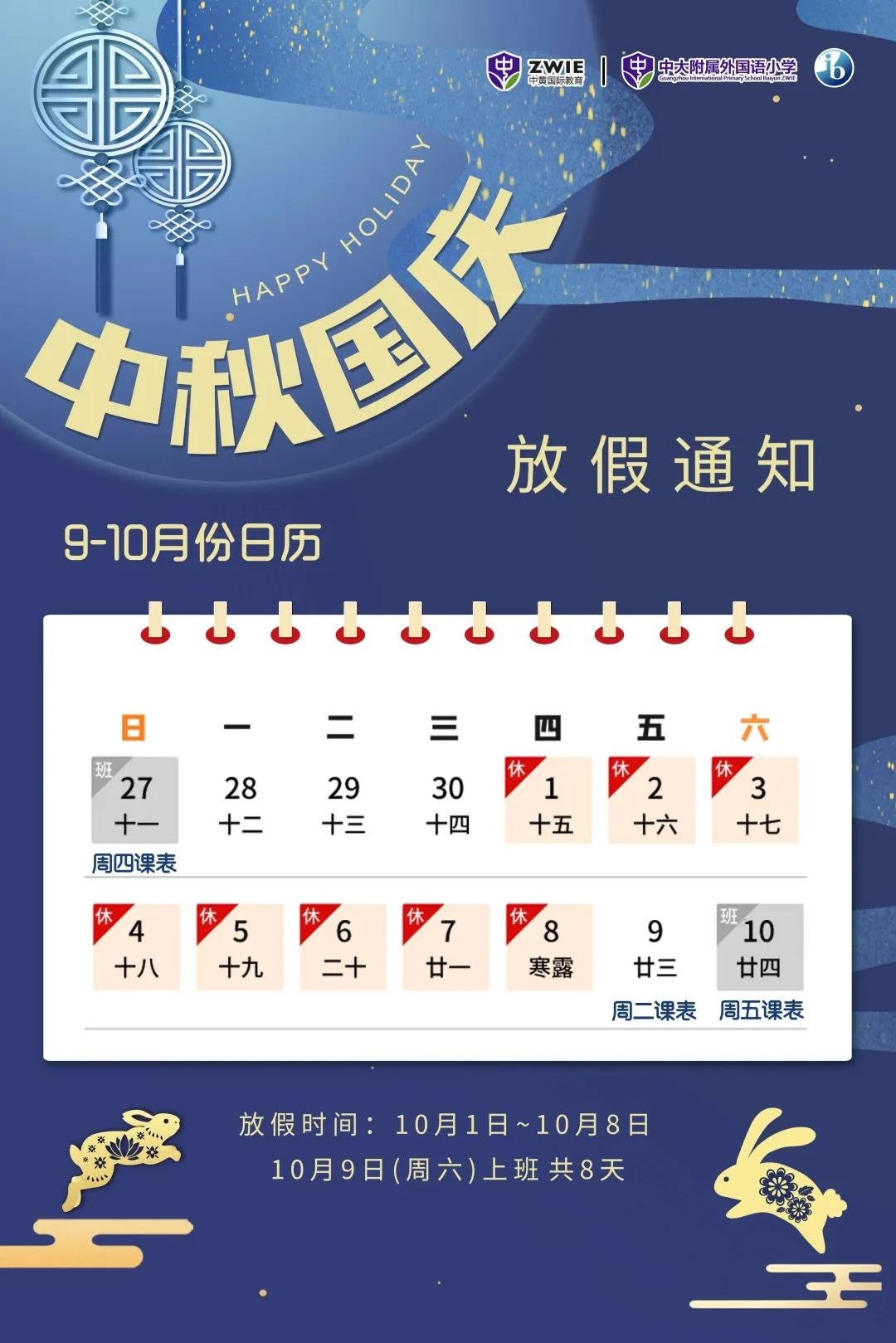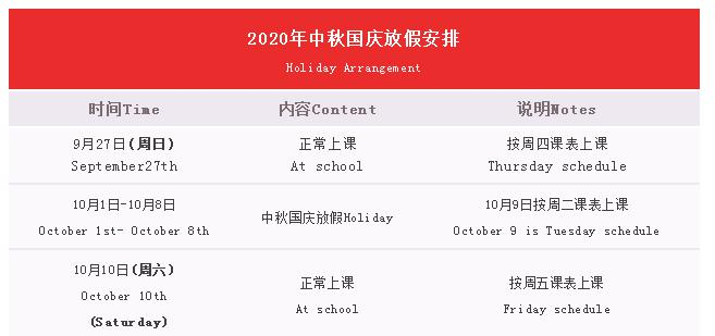 According to the notice issued by the General Office of the State Council, combined with the situation of our school, the holiday arrangement for the National Holiday and Mid-Autumn Festival in 2020 is as follows :