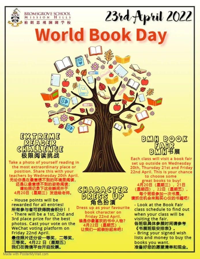 今年的世界图书日将在4月23日周六举办,BMH将举行三个庆祝活动:“极限阅读者”比赛、图书展和角色扮演日。