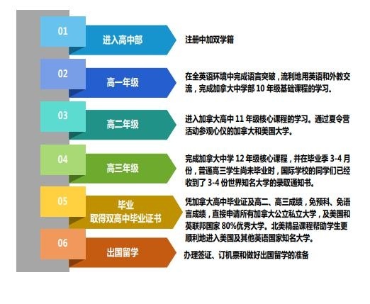 实行小班制教学, 每个班设计人数不超过25人。 在三年制的学习过程中, 集中学习加拿大高中核心课程及北美精品课程。 加方课程使用原版加拿大公立高中教材, 由具有加拿大中学教师资格的老师教授, 进行“全英语环境” 教学。 学生不仅能通过三年全英语环境的学习, 申请到理想的世界名校, 而且拥有过硬的英语课程学习能力, 能顺利的适应国外的大学学习环境, 完成学业并取得优良成绩。