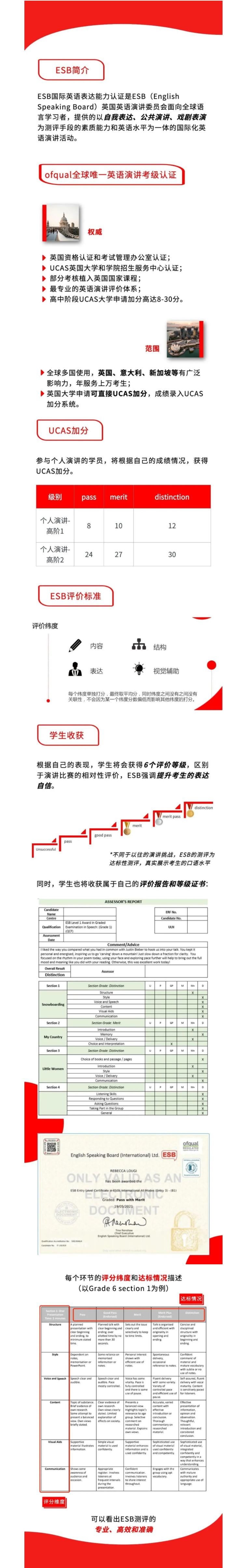 作为全球唯一Ofqual认证演讲表达测评,ESB依托其逾70年的测评积累,通过个人兴趣、诗歌故事分享、朗诵文段、学科主题、新闻事件讨论、表演艺术作品分享、职业谈话、模拟面试等多种形式激发学生们对于英语学习的热情,锻炼他们用英语演讲交流的能力,同时也为学生申请英国大学提供高达8-30分的额外UCAS加分的机会