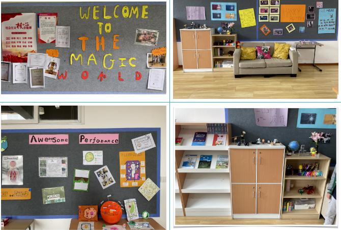G6B则是认为“班级”是第二个家,通过贴图和绘画装饰墙面,打造温馨之家。同时教室里还有一个展示优质作品的平台,海报、模型、社区服务和文章等都会展示在这里。