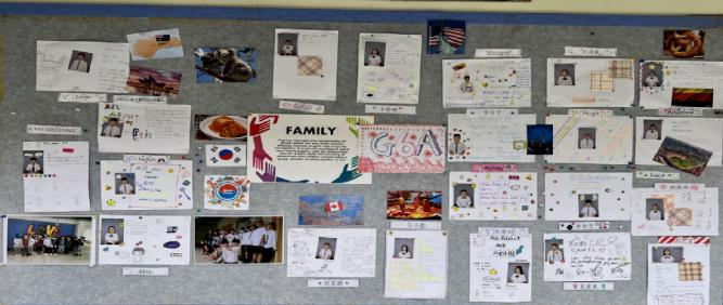 G6A班以“家”为主题,这个“家”一语双关,既是自己的“国家”也是自己的“小家”。同学们在外墙上展示了自己家乡的文化、习俗、风物,供来自其他国家的老师和同学们了解:来自成都的同学展示了火锅、来自韩国的同学介绍了泡菜,来自澳大利亚的科普了考拉......