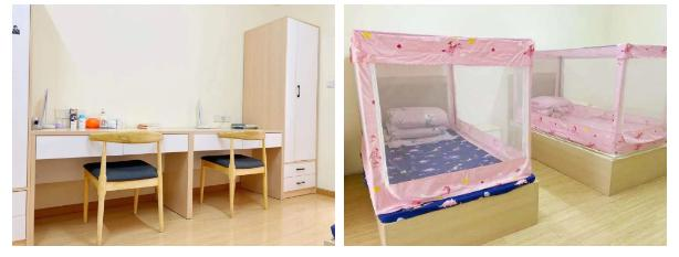 宿舍一楼配置读书室、学习室、娱乐室等,让孩子在宿舍也可以有独立的空间,二楼以上为学生宿舍,2人间,每个房间标准配置空调、空气净化器、卫生间、淋浴间、WIFI,干湿分区。
