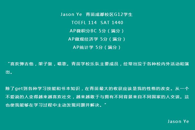 当提及以后的发展时,Jason表现出异乎寻常的自信,他说:“等到大学读完,自己还是要从事自己最喜欢的行业,金融相关领域,不论多困难,自己都可以胜任,相信自己会有施展的舞台,而且我还有一个小小的期待,希望我的母校青苗成都可以给毕业生们提供一些实习机会,让我们有机会“重返校园”。还有就是想告诉学弟学妹们珍惜在学校里的生活,一定要敢于和老师交流,他们能给的帮助非常大。”