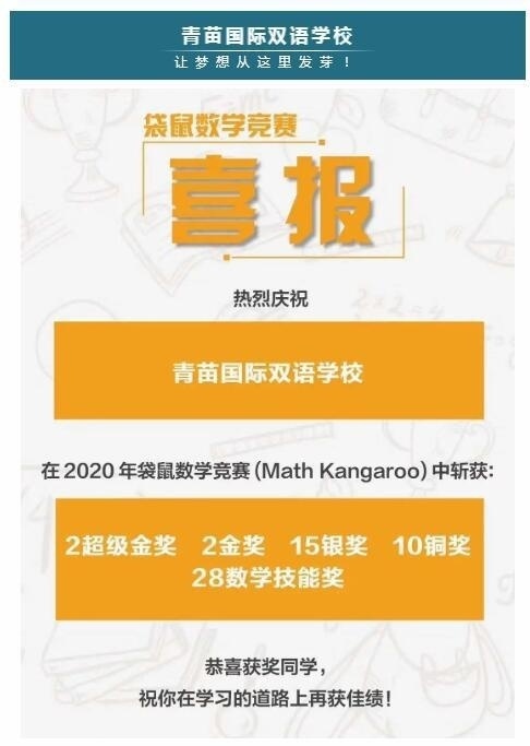 热烈庆祝青苗国际双语学校在2020年袋鼠数学竞赛(Math Kangaroo)中斩获多项大奖!此次中国赛区共有来自中国大陆30多个省份、230多个城市的近22000名学生参赛,青苗上东、顺义、常营、昆明、成都五所校区强强联手,青苗小将不畏强敌、初战告捷!