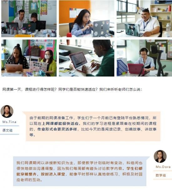 考虑到疫情持续及疫情的变化莫测,我们学校一直以来都有做好随时上网课的准备,比如购买网课平台的长期服务,鼓励老师们平时多使用平台,幼教部主要用以跟家长互动沟通,把课程活动或教学反馈发布在平台供家长查看等,中小学则用于布置学生作业,这些都是在促进家校互动的同时增加老师们对网课平台的熟悉度。