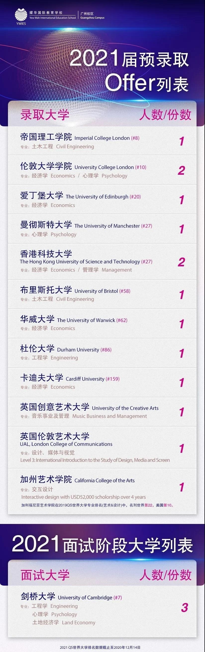 星光不问赶路人,时光不负有心人,广州耀华第四届毕业生不断传来升学的捷报。截至2020年12月14日,广州耀华的14位毕业班学生,共收到14封来自英国、美国和中国香港地区等各大名校的录取通知书和来自剑桥大学的3个面试邀约。