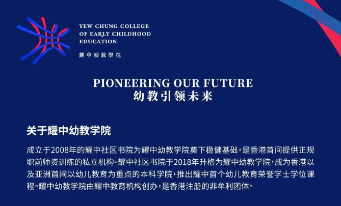 耀中幼教学院于2018年在香港成立,隶属耀中教育机构,为香港注册非牟利团体。耀中教育机构1932年成立于香港,迄今超过88年。耀中及其姐妹机构耀华国际教育学校多年来在中国香港、中国内地、美国硅谷等地区,推广幼儿教育及国际化教育,于国际教育界享负盛名。耀中幼教学院提供不同程度的专业教师培训课程,致力于为香港和其他地区培养充满新一代充满热情和激情的幼教专业工作者。