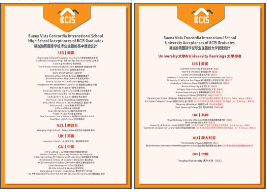 从4届毕业生就读大学的数据来看,曦城学子85%美国高中毕业后进入美国前50名牌大学,少部分选择音乐艺术方向英美院校。2019年斯坦福大学在深圳录取了3名学生,其中2位2015年毕业于曦城国际学校;2位毕业生分别就读于藤校哥伦比亚大学、康奈尔大学,更有多枚波士顿大学、加州大学圣塔芭芭拉分校、多伦多大学、墨尔本大学等QS世界排名前100的综合性大学,艺术方向有多名学生就读于美国创意艺术学院、罗德岛艺术学院、伦敦艺术学院等,3位艺术方向学生累计获得奖学金469,360美元。