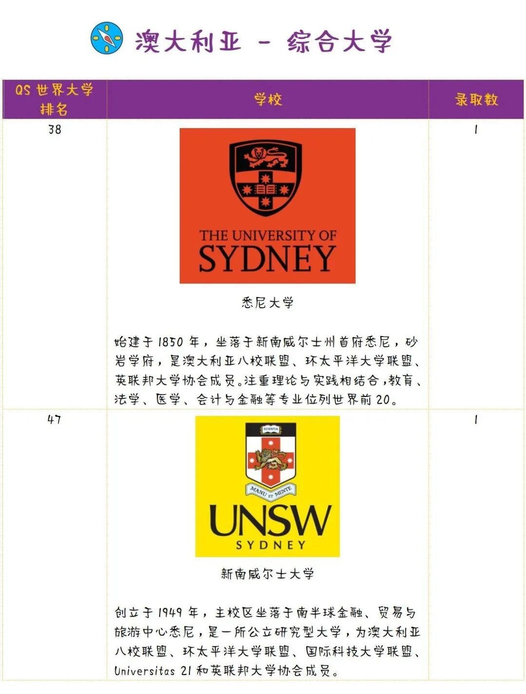 收获以下澳洲八大、QS世界大学排名前50澳洲大学录取:悉尼大学、新南威尔士大学。