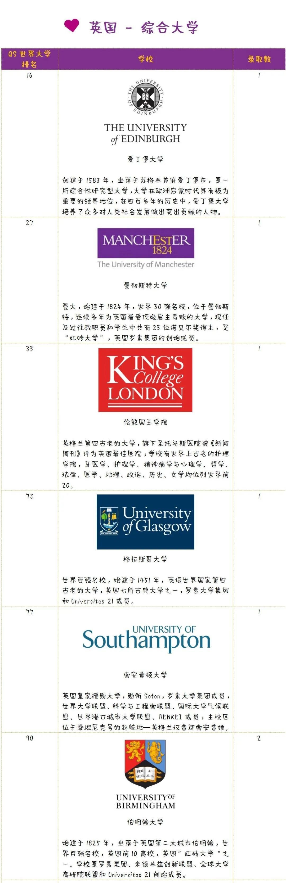 收获以下QS世界大学排名前50英国大学录取:爱丁堡大学、曼彻斯特大学、伦敦国王学院。