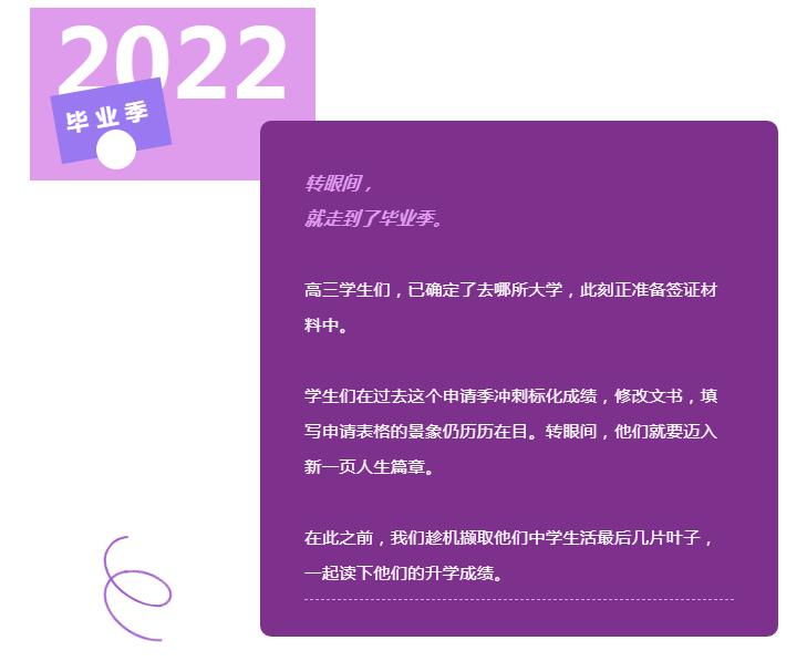 迄今为止,我校已培养出3届优秀毕业生,学生们收到了许多名校录取(芝加哥大学、帝国理工学院、罗切斯特大学、纽约大学、波士顿大学、加州伯克利、早稻田大学...),去到了不同国家留学,这与学生们的努力、学校的培养关系密不可分。