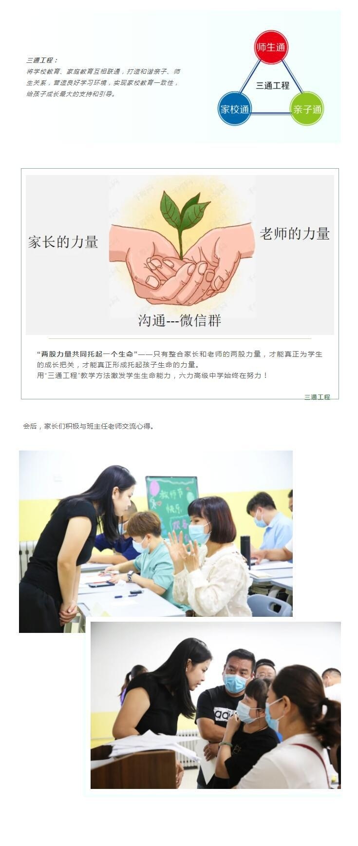 家校共育、师生联动 激发孩子的生命能量 高一年级对于学生而言是至关重要的一年,不仅是整个高中生涯的起点,更是同学们实现身份、心态过渡,打牢学科基础的关键一年。高一伊始,同学们很容易出现厌学、烦躁等一系列不适应高一生活的“症状”,直接影响未来三年的学习生活。 为此,班主任特意向家长介绍了六力学校“三通工程”教学方法,并鼓励家长积极加入家长群,运用群聊联通家校、师生、亲子的关系,共同为学生创设正向能量场,促使学生找到学习的乐趣,主动学习。