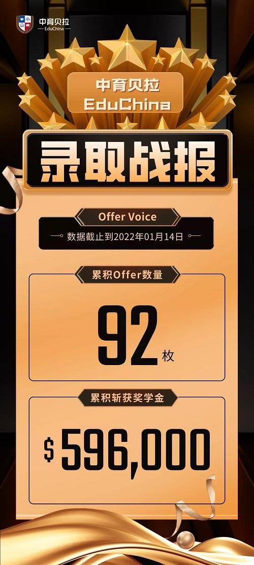 2022年,中育贝拉国际教育集团各校区相继传来好消息。截止1月14日,中育贝拉2022届毕业生收到早申Offer共计92枚,其中包括奖学金596,000美金。当然,对于中育贝拉国际教育集团的学子而言,录取捷报是对大家的报答!我们的同学不仅收到了美国著名院校的录取,同时还斩获了加拿大、英国、澳大利亚等著名大学的录取,申请季还在进行中,我们期待更多好消息的到来!