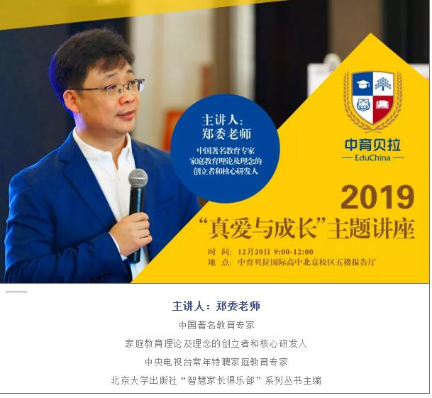 12月20日9:00-12:00中育贝拉教育集团教育研究院特邀郑委老师,免费开展“真爱与成长”主题讲座,让您可以了解爱与幸福的奥秘,汲取家庭教育的精髓,获得专业的教育解答,学会如何教育孩子。